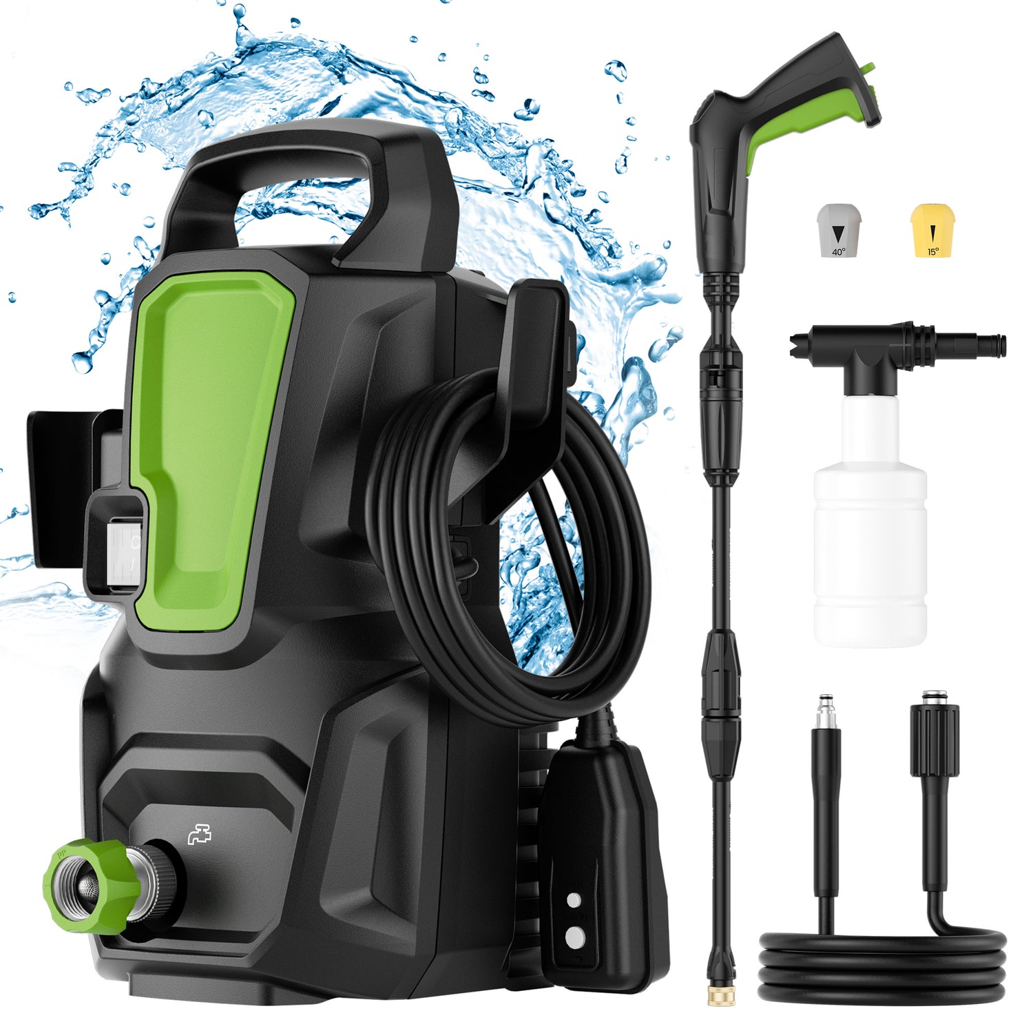 - đă15°&45°NOZZLES AND FOAM SPRAYERă Equipped with 15 ° and 45 ° nozzles and a foam sprayer, it is capable of powerfully cleaning stubborn stains such as floor grease, roof dirt, etc., as well as gently cleaning lawn soil and car surfaces. It can meet most of your cleaning needs in your daily life.